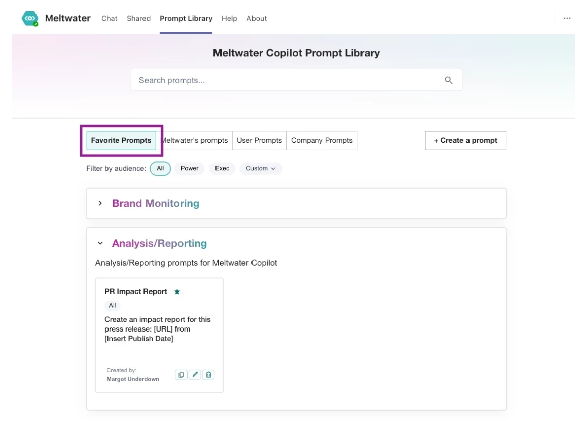 The Prompt Library is a collection of ready-to-use prompts you can adapt to your brand, market, or competitors. Each prompt includes placeholders so you can quickly personalize it. The Prompt Library is located at the top of the Meltwater Teams Agent: