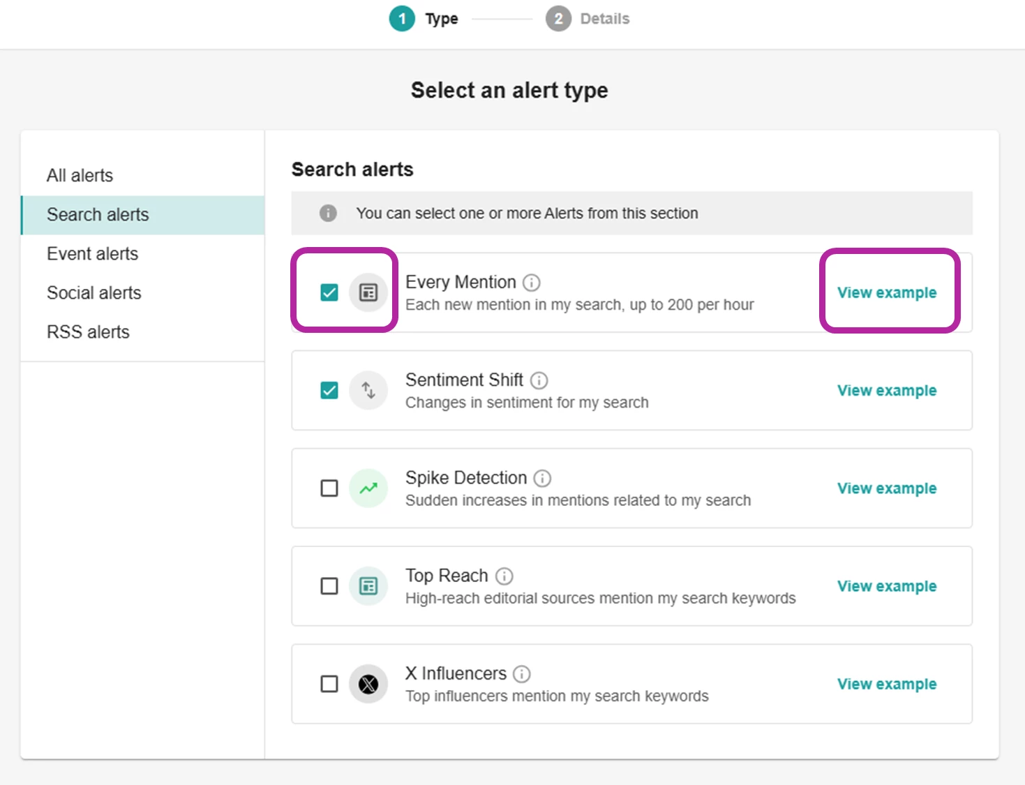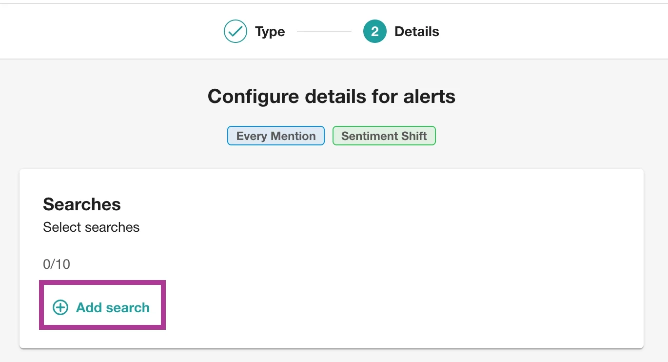 Wenn Sie einen Alert für die Spike-Erkennung einrichten, wählen Sie aus drei Empfindlichkeitsstufen (Weniger Alerts, Ausgewogene Alerts oder Mehr Alerts), je nachdem, wie häufig Sie über Änderungen im Umfang der Medienberichterstattung benachrichtigt werden möchten.
