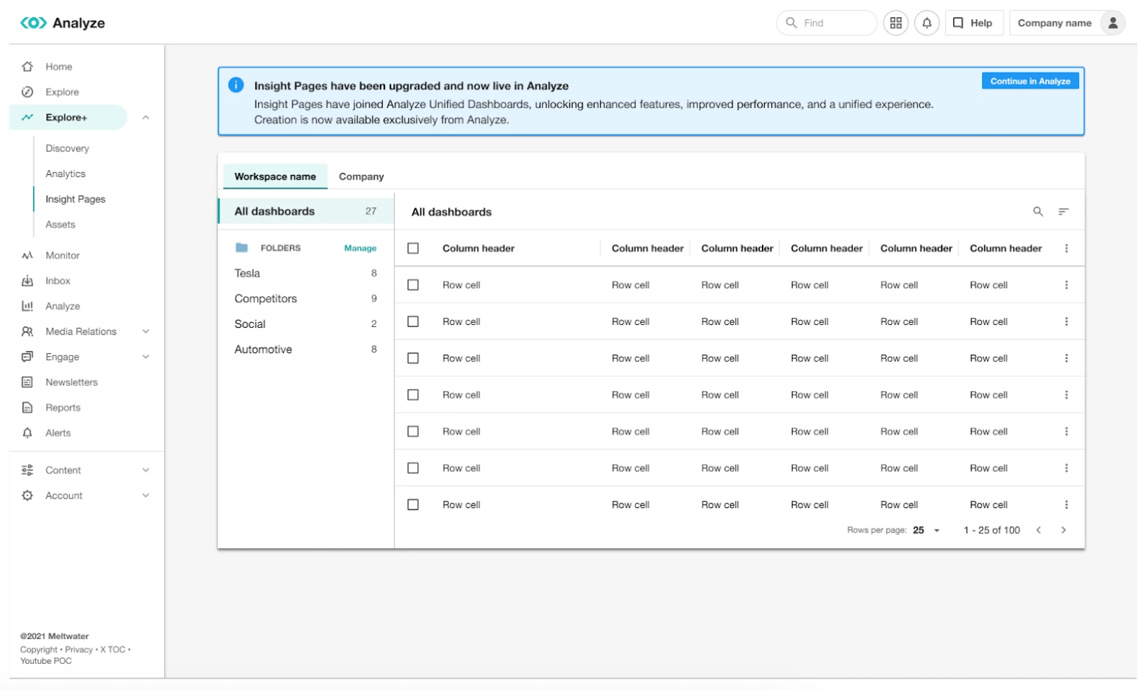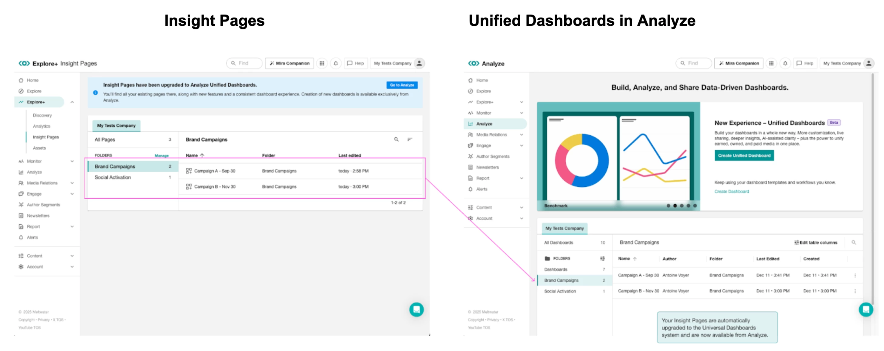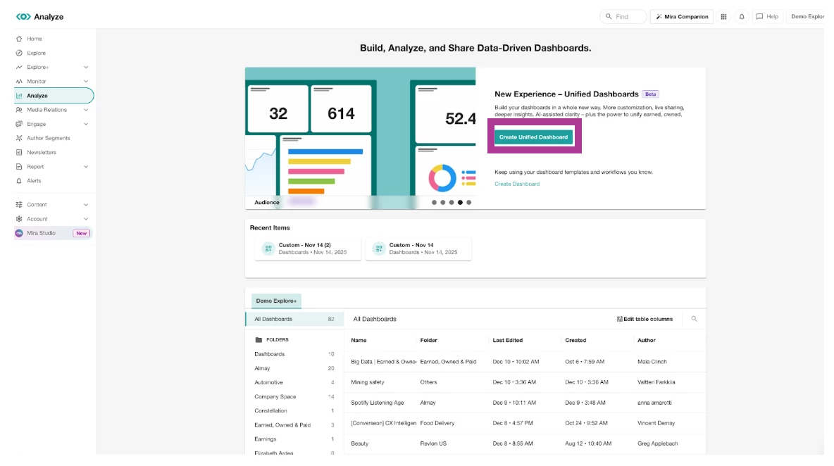 Starting the week of December 15th, Unified Dashboards in the Analyze product will replace your previous Explore+ Insight Page dashboards. This updated experience brings your dashboards into one central location for easier editing, data exploration, and visualization.