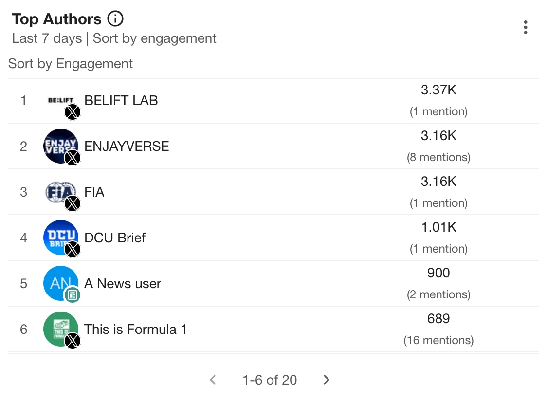Top Authors - Displays the most active authors or publishing sources ranked by the selected metrics (e.g., mentions, engagement, reach).