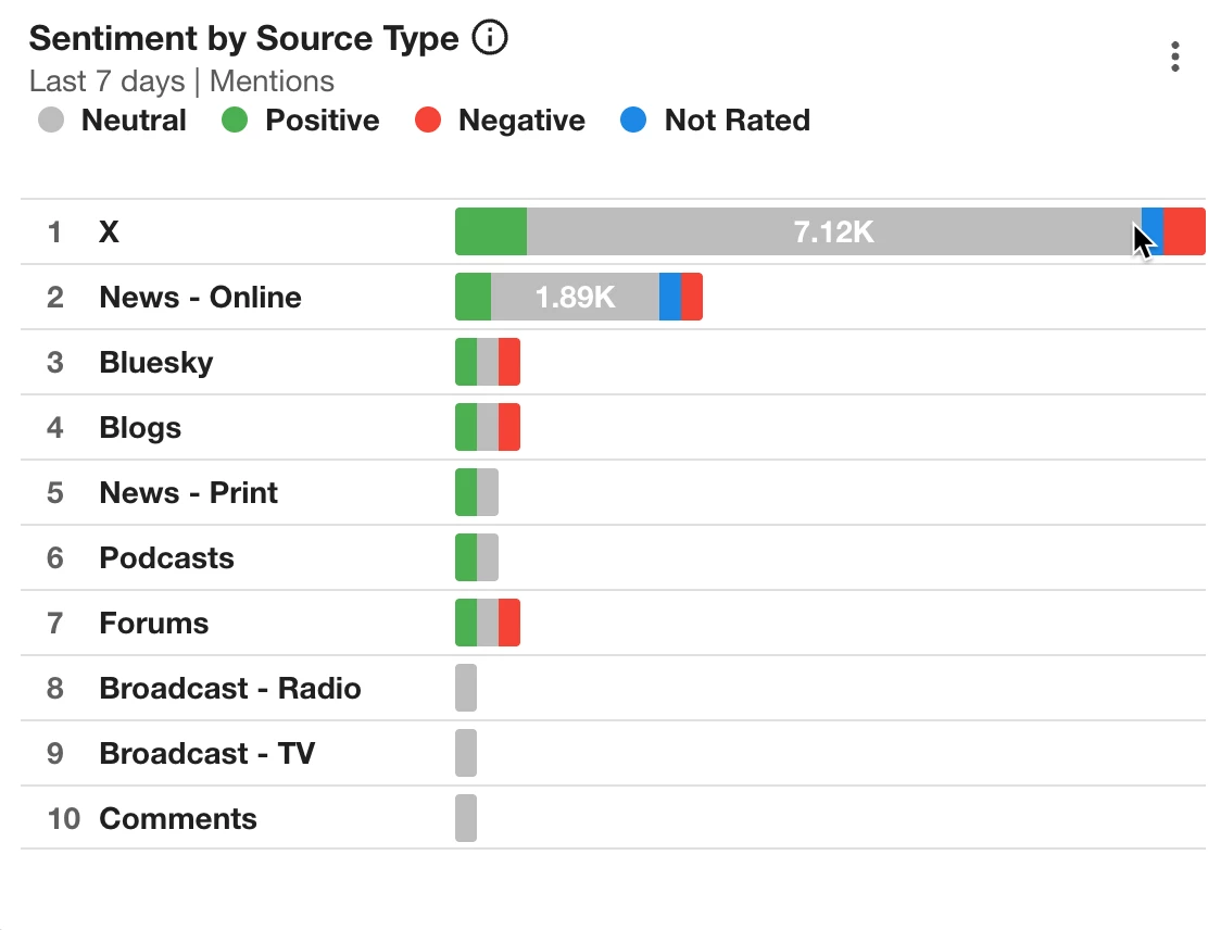 Sentiment by Source Type - Shows category totals and their breakdown across horizontal bars. Breakdown by channel (e.g., news, blogs, X, Facebook). Distribution of positive, neutral, and negative mentions.