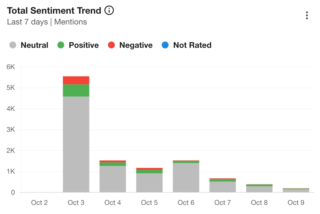 Total Sentiment Trend - Total number of times your search terms appear across all sources in the selected date range. Shows category totals and their breakdown across vertical columns. Distribution of positive, neutral, and negative mentions.