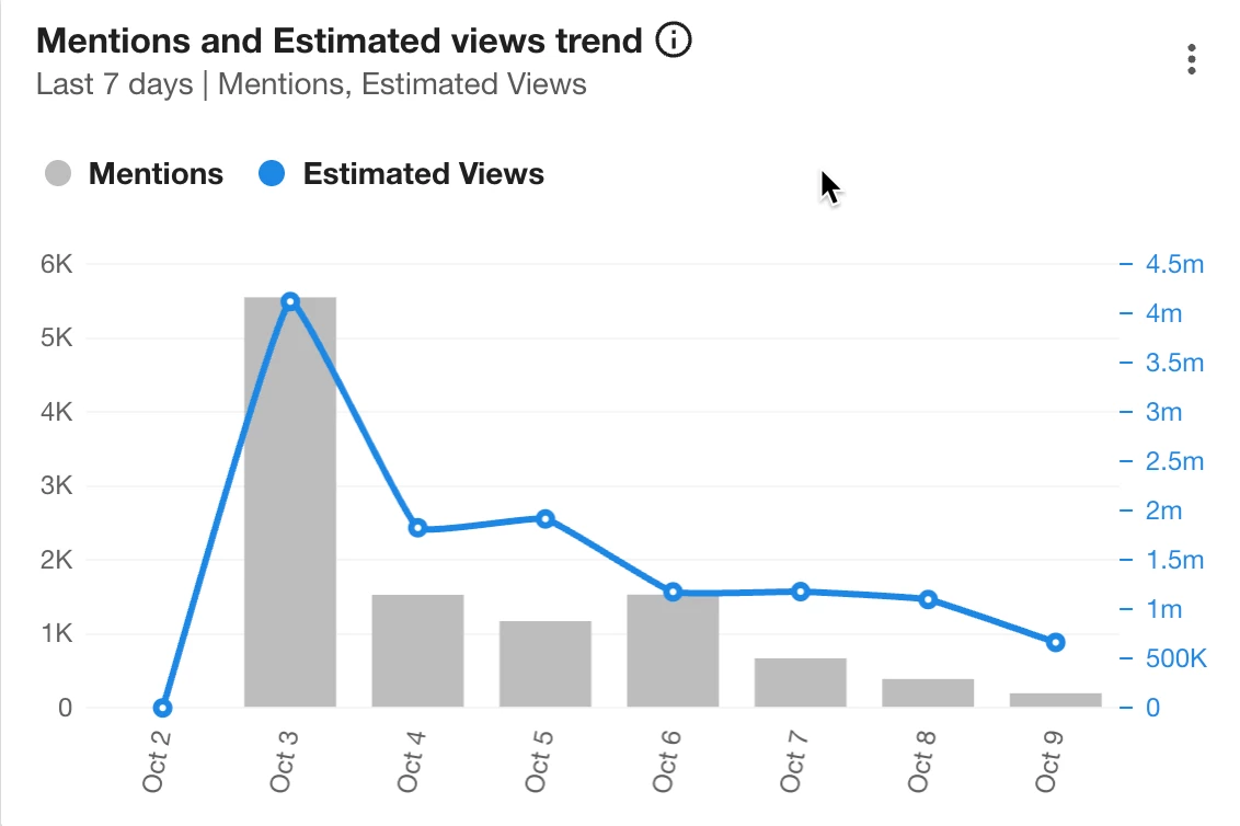 Mentions and Estimated Views Trend - Projected numbers of times mentions may have been seen by an audience. (OR An estimate of how many people may have viewed the mentions across all sources). Displays two time-based metrics side by side for comparison.