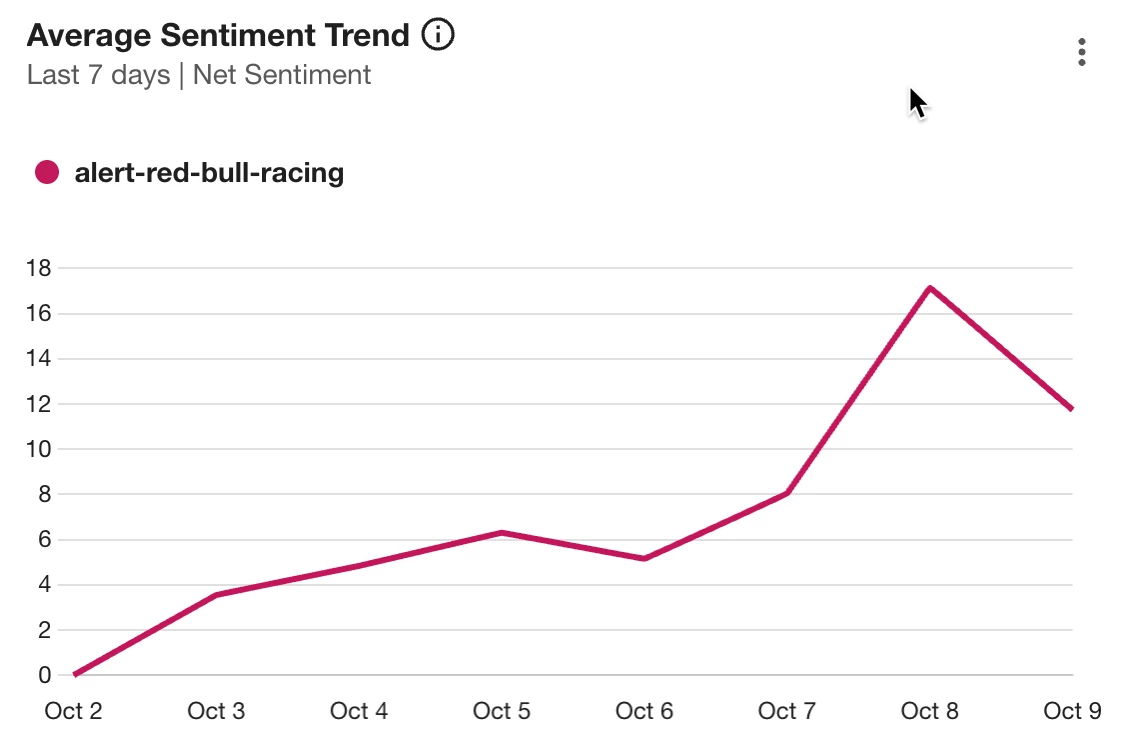 Average Sentiment Trend - Measures overall tone of conversation by comparing positive and negative sentiment. Compares multiple metrics or segments over time using separate lines. Compare multiple searches you’ve set up within Meltwater.