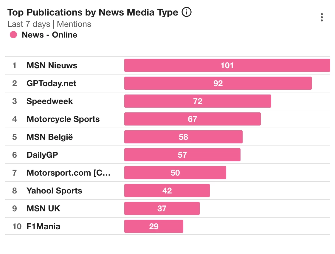 Top Publications by Mentions - Displays the most active authors or publishing sources ranked by the selected metrics (e.g., mentions, engagement, reach).