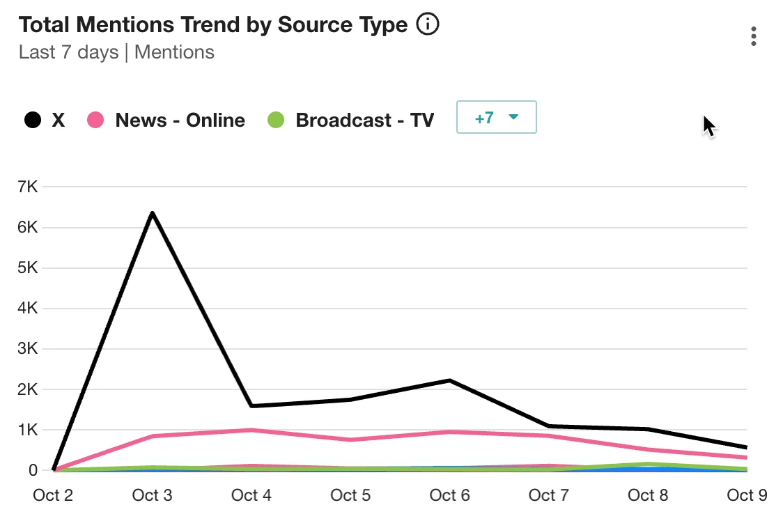 Total Mentions Trend by Source Type - Total number of times your search terms appear across all sources in the selected date range. Compares multiple metrics or segments over time using separate lines. Breakdown by channel (e.g. news, blogs, X, Facebook).