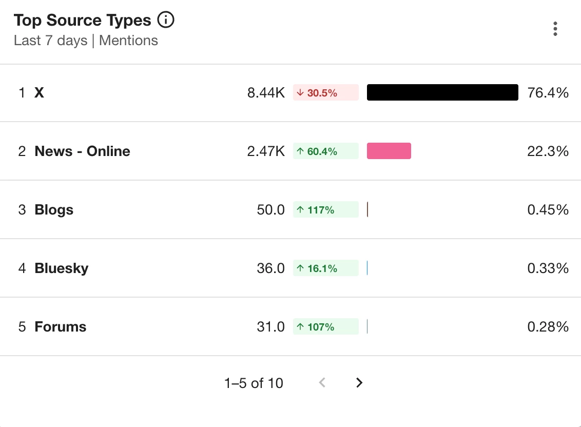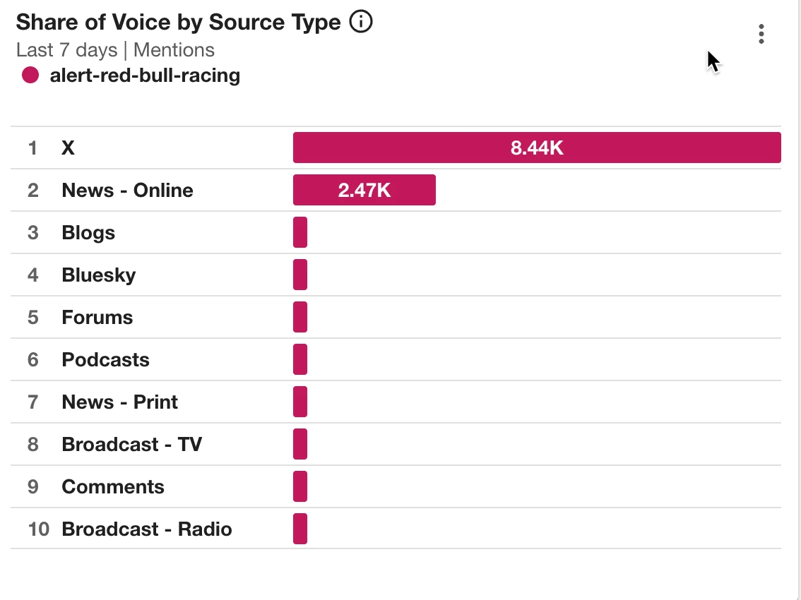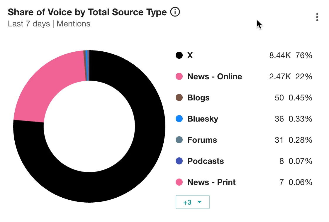 Share of Voice by Source Type - Shows category totals and their breakdown across horizontal bars. Breakdown by channel (e.g., news, blogs, X, Facebook). Compare multiple searches you’ve set up within Meltwater.