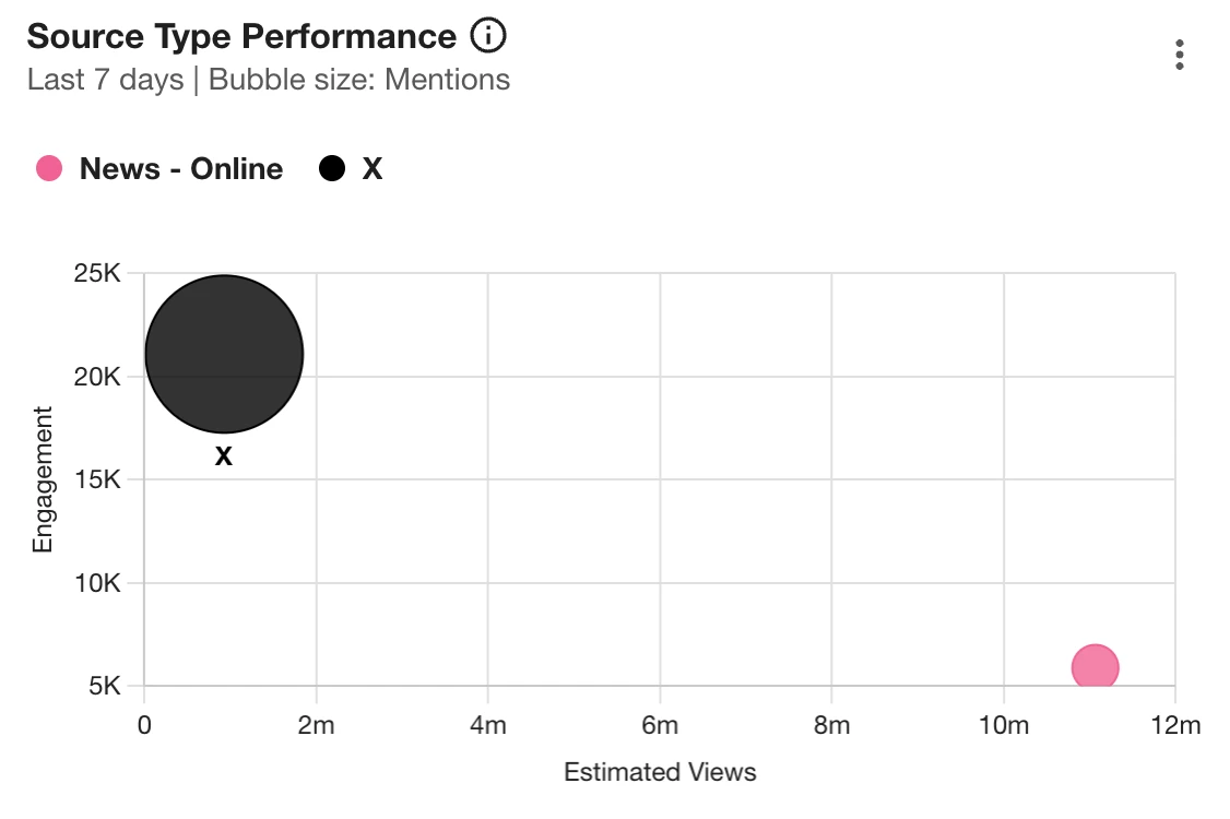Source Type Performance - Plots data bubbles sized to represent an additional dimension. Breakdown by channel (e.g., news, blogs, X, Facebook).