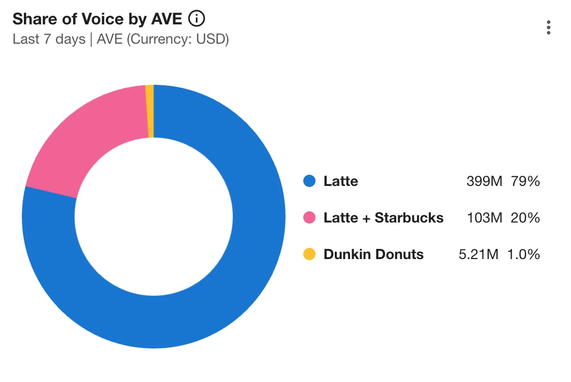 Share of Voice by AVE - The calculated monetary value of the media exposure if purchased as advertising space (Advertising Value Equivalent). Displays proportions of a whole in a circular, donut-shaped chart. Compare multiple searches you’ve set up within Meltwater.