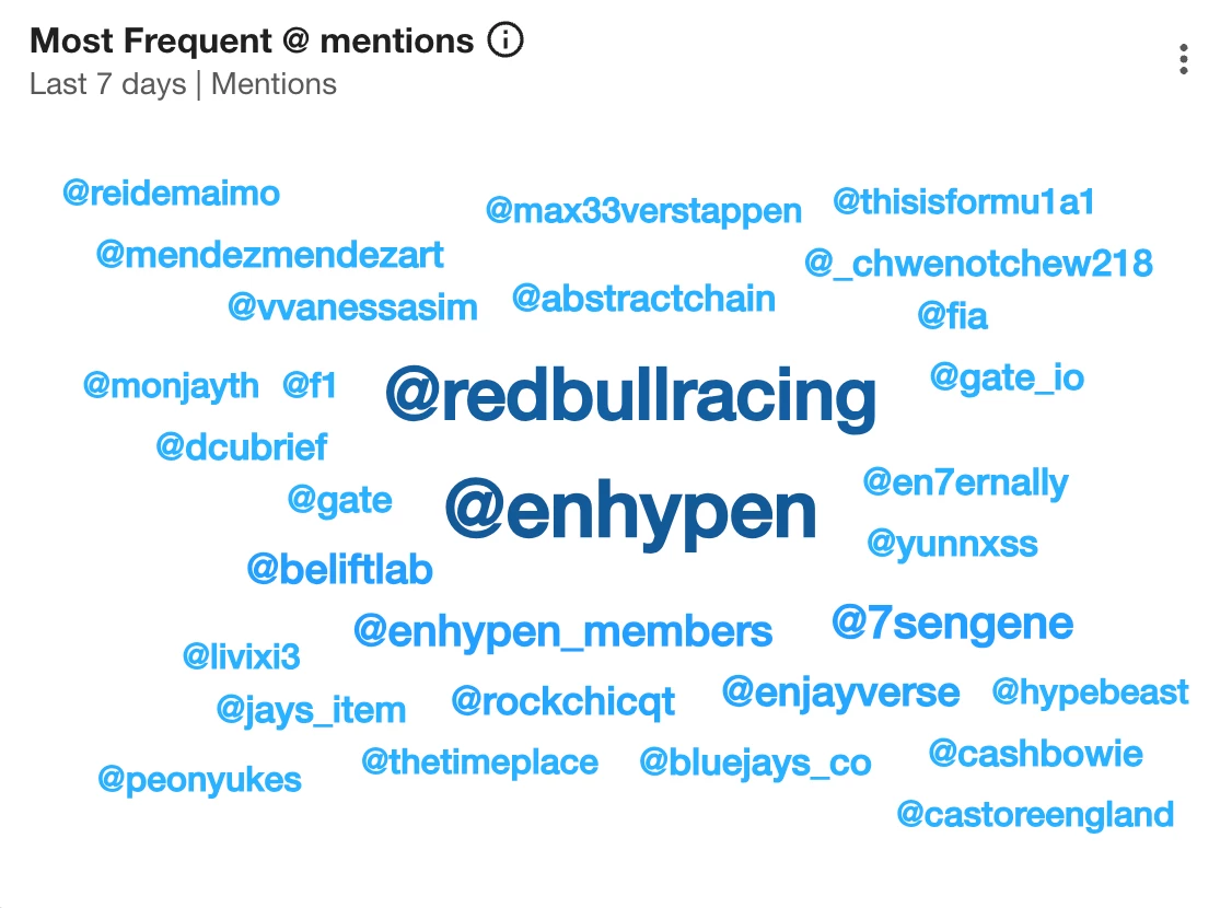 Most Frequent @ Mentions - Displays keywords by size based on frequency or importance. X handles that mentioned your search.