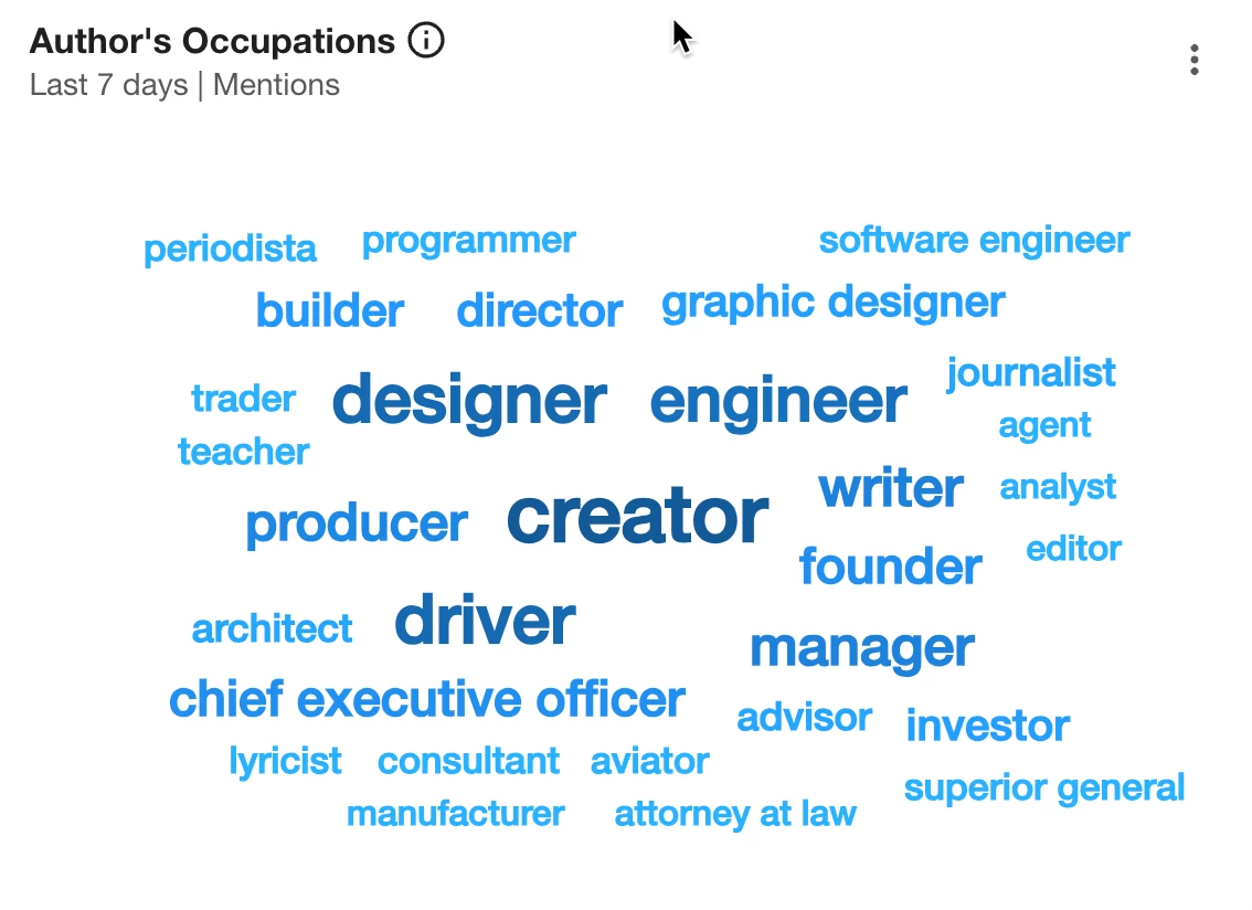 Author’s Occupations - Displays keywords by size based on frequency or importance. Inferred professionals to content authors.