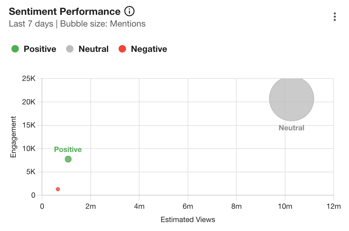 Sentiment Performance - Plots data with bubbles sized to represent an additional dimension. Distribution of positive, neutral, and negative mentions.