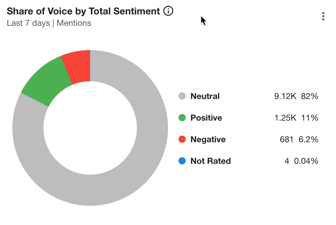 Share of Voice by Total Sentiment - Displays proportions of a whole in a circular, donut-shaped chart. Distribution of positive, neutral, and negative mentions.