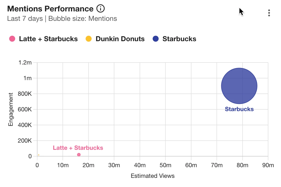 Mentions Performance - Plots data with bubbles sized to represent an additional dimension. Compare multiple searches you’ve set up within Meltwater.