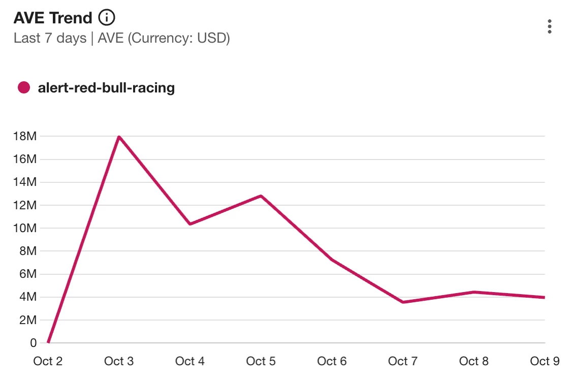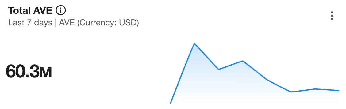 Total AVE - The calculated monetary value of the media exposure if purchased as advertising space (Advertising Value Equivalent). Displays a single key performance as a large number or percentage.