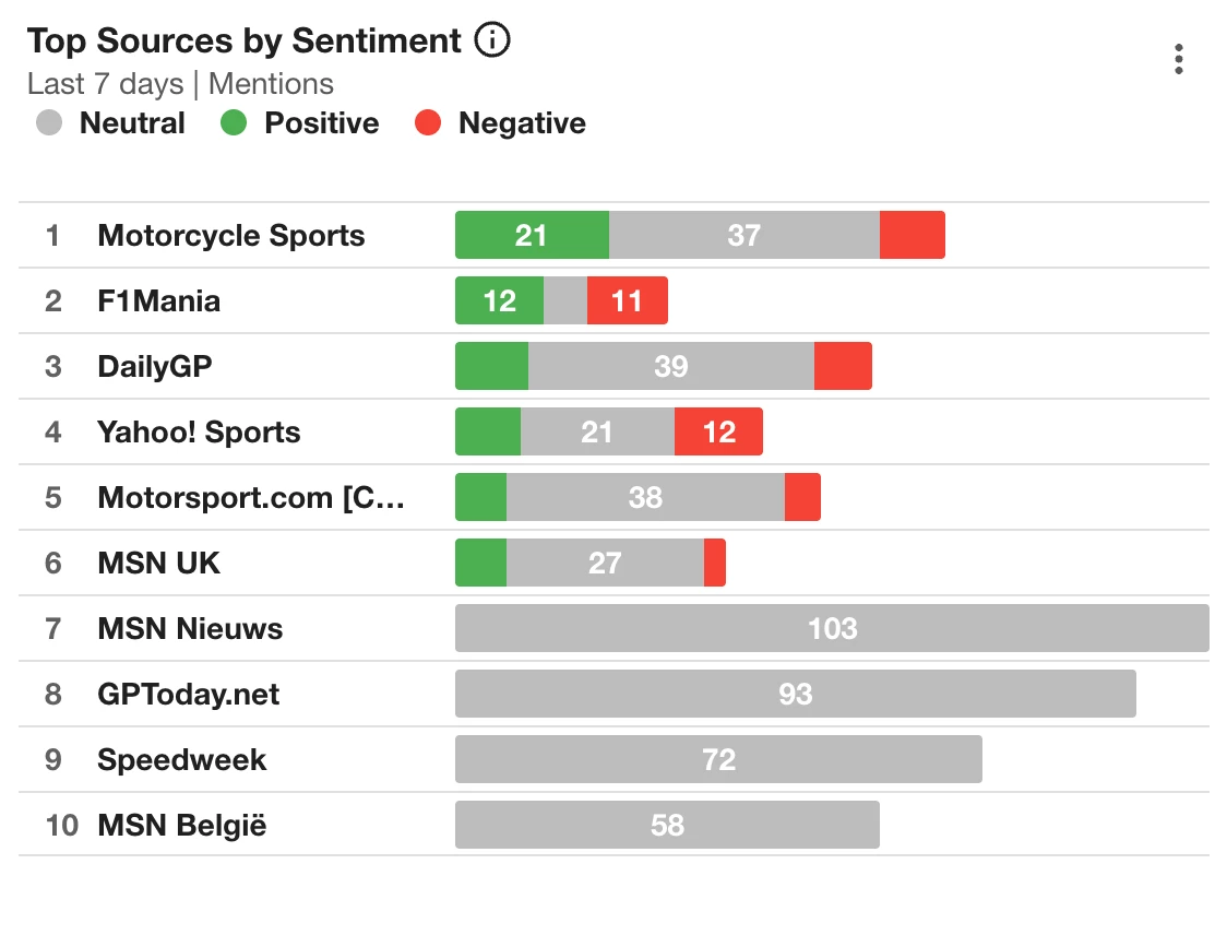 Top Sources by Sentiment -.Shows category totals and their breakdown across horizontal bars. Specific websites, publications, or platforms. Distribution of positive, neutral, and negative mentions.