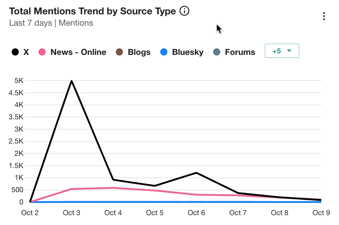 Total Mentions Trend by Source Type - Total number of times your search terms appear across all sources in the selected date range. Compares multiple metrics or segments over time using separate lines. Breakdown by channel (e.g., news, blogs, X, Facebook).