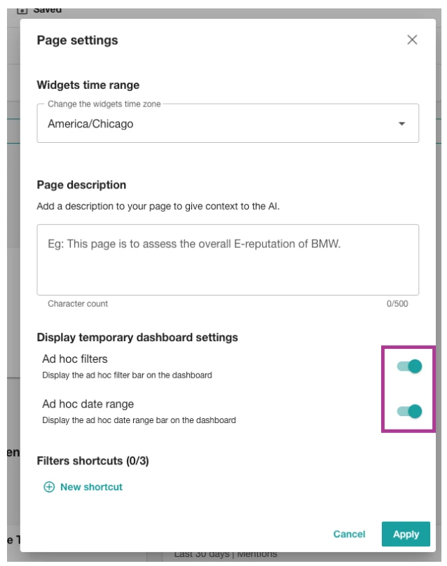 - Ad hoc filter: Display the ad hoc filter bar on the dashboard.
