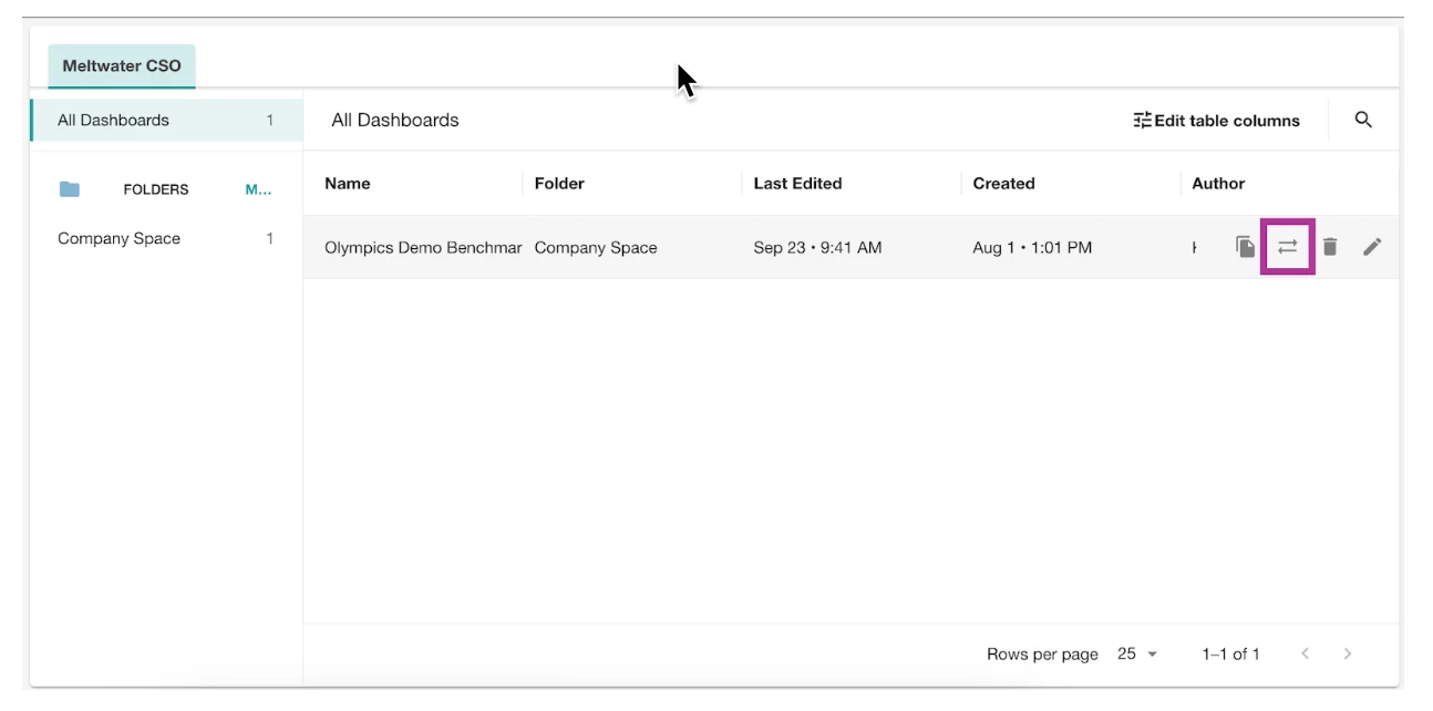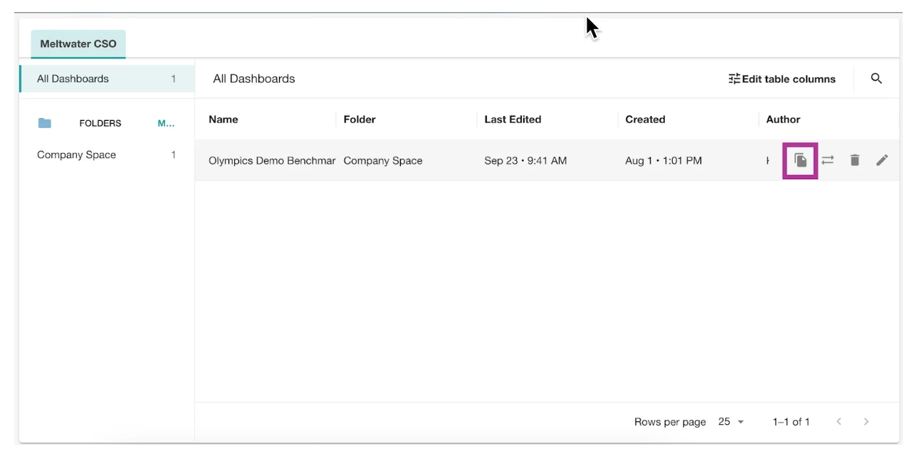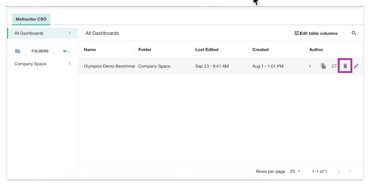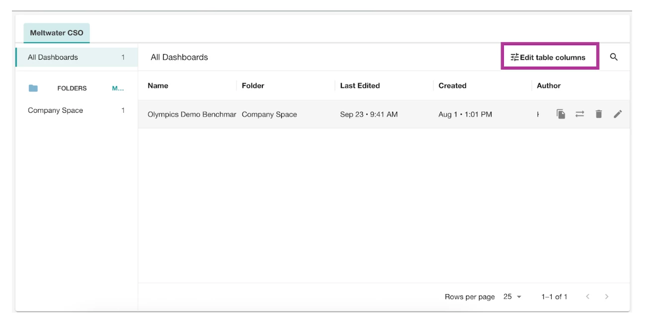 The dashboard table is home to all dashboards. You can duplicate, move, delete, and rename dashboards here, as well as edit the table columns.