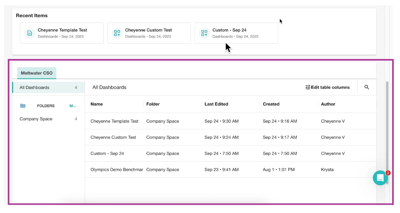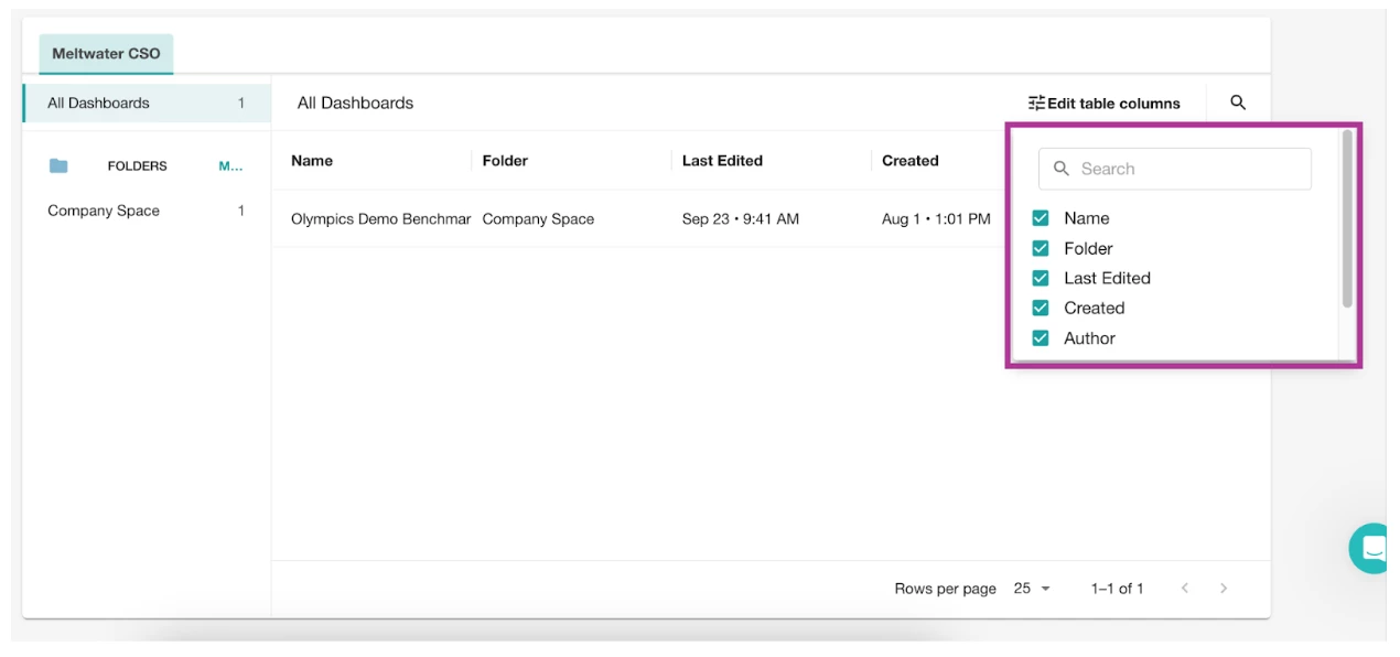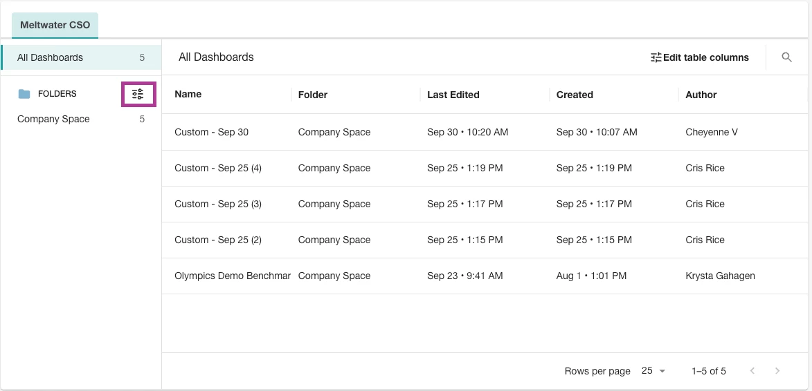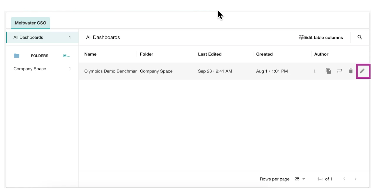 The dashboard table is home to all dashboards. You can duplicate, move, delete, and rename dashboards here, as well as edit the table columns.