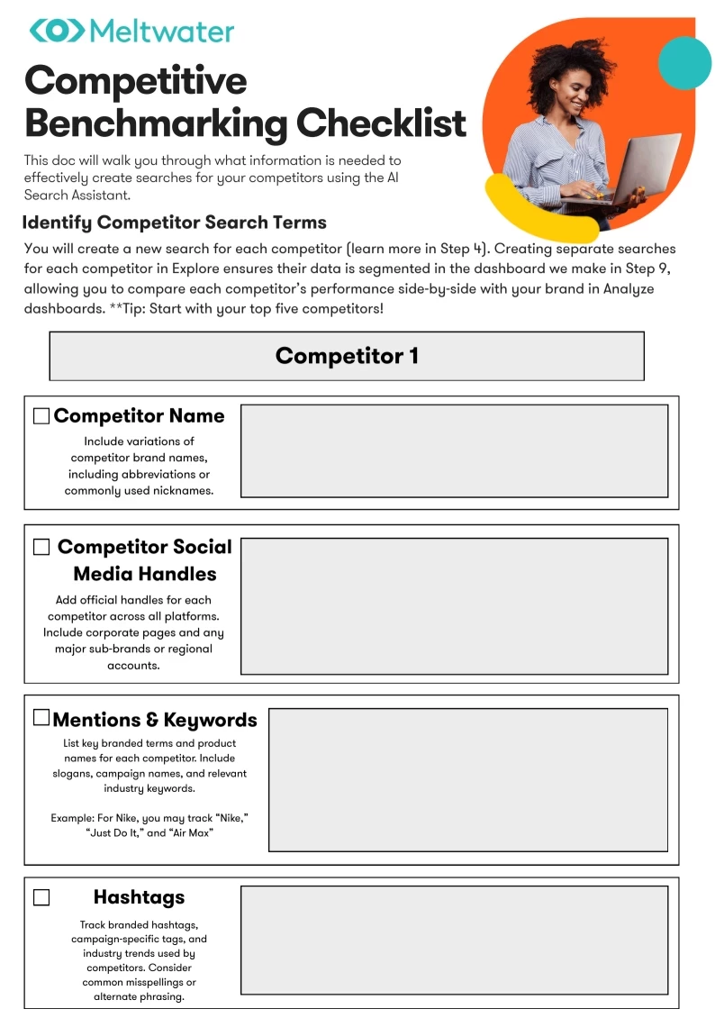 Si eres nuevo en la Evaluación Comparativa de la Competencia, te recomendamos usar la Lista de Verificación Digital para la Evaluación Comparativa de la Competencia para identificar los elementos clave para tus búsquedas de competidores. Completar esta hoja de trabajo de antemano te ayudará a refinar tu enfoque de seguimiento y obtener los resultados más relevantes.