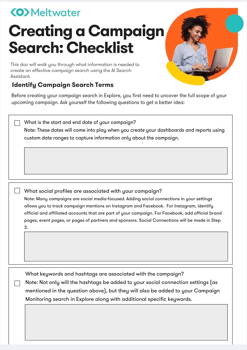 Si eres nuevo en Monitoreo de Campañas, hemos creado una lista de verificación digital que te introduce a los elementos clave que puedes incluir en tus búsquedas. Es beneficioso completar esta hoja de trabajo antes de sumergirte en Explore. Podrás proporcionar esta información al Asistente de Búsqueda con IA.