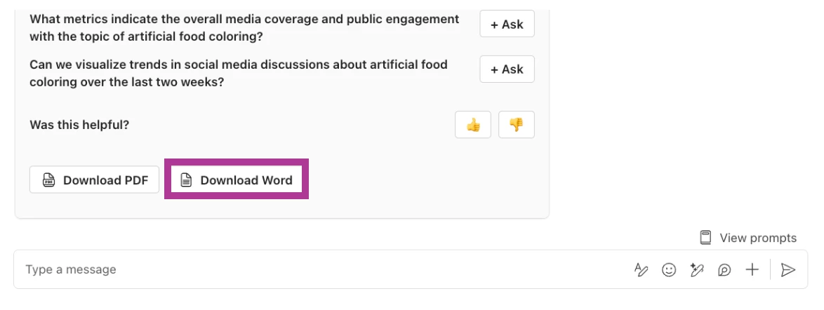 You can now download your AI-generated insights—including charts, images, and summaries—directly as a PDF or Word Doc with just one click. This eliminates the need for manual screenshots, making it simple to share comprehensive reports with your team, even if you're not a technical user. Whether you're preparing a presentation or sharing findings in real time, exporting insights is now faster, cleaner, and more professional.