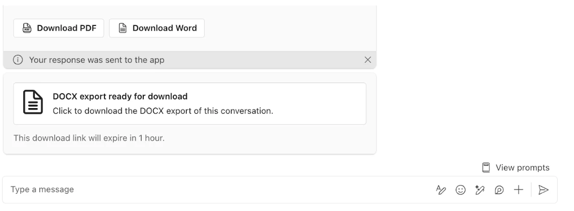 “DOCX export ready for download. Click to download the DOCX export of your conversation. The download link expires after 1 hour.”
