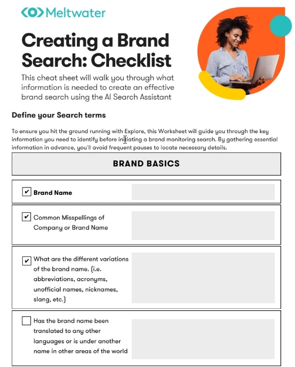 Wenn Sie neu im Bereich Brand Monitoring sind, haben wir eine digitale Checkliste erstellt, die Ihnen die wichtigsten Elemente vorstellt, die Sie in Ihre Suchanfragen einbeziehen können. Es ist vorteilhaft, dieses Arbeitsblatt auszufüllen, bevor Sie mit dem Explore starten. Sie können den AI Search Assistant mit diesen Informationen anweisen.