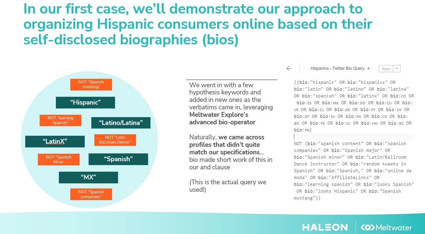 Naturally, we came across profiles that didn’t quite match our specifications - this helped us improve the query and ensure we exclude “noisy” or irrelevant mentions. Take a look at the actual keywords (and operators) we used, particularly the exclusion terms: