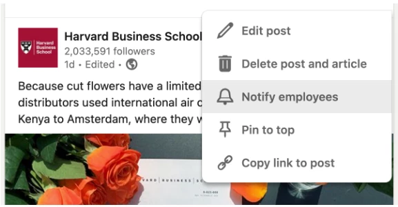 One of my favorite ways to give employees a nudge is by using built-in tools on social media platforms. LinkedIn is HBS’s strongest and most engaged social channel, and we’ve helped elevate that by using the “Notify Employees” button on key pieces of top-performing content.