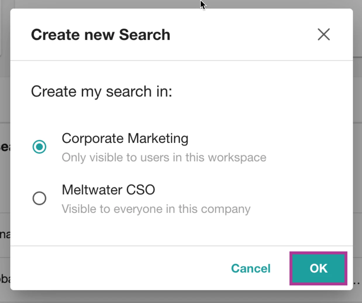 - Sélectionnez l'espace de travail ou le compte dans lequel vous souhaitez enregistrer votre Recherche optimisée