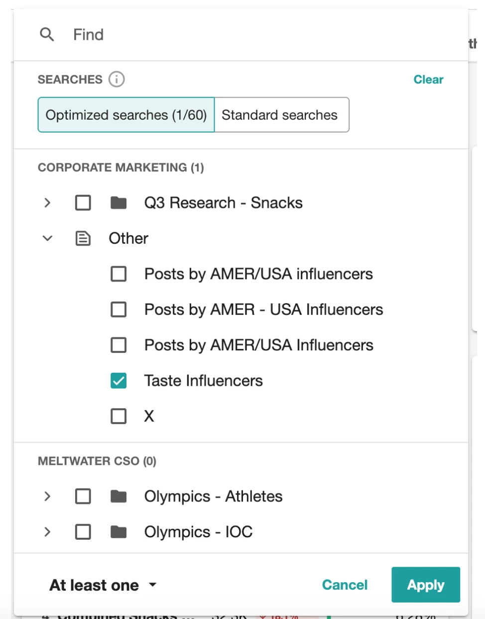 Note : votre recherche basée sur une liste de sources apparaîtra avec des résultats dans Analytics et Insight Pages - dans le dossier où elle a été enregistrée. Les recherches non enregistrées dans un dossier apparaîtront dans le menu déroulant « Autre ».