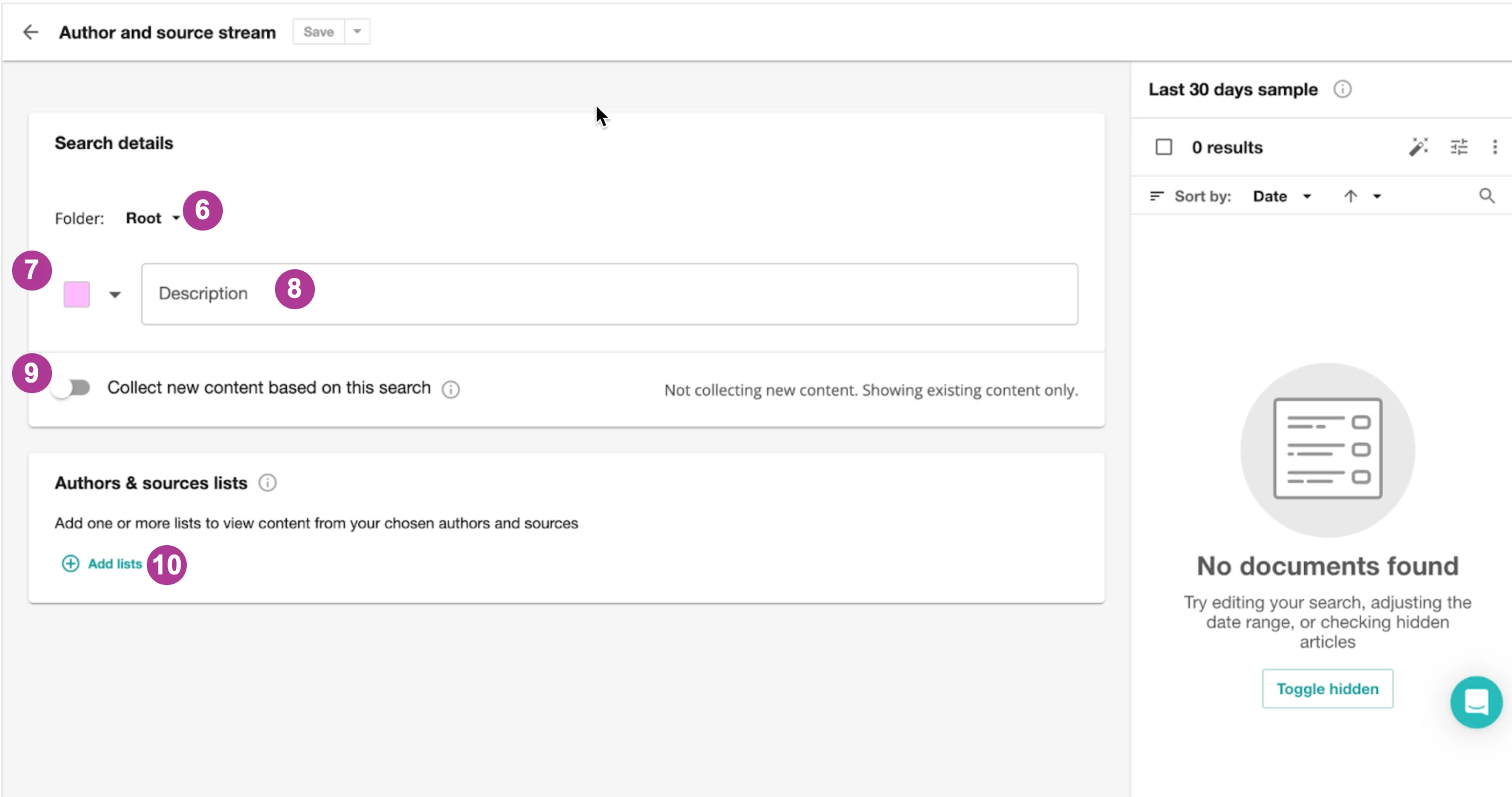 - Activez ou désactivez Collecter les nouveaux contenus basés sur cette recherche pour ajouter dans votre compte les publications provenant des sources et des auteurs de la liste