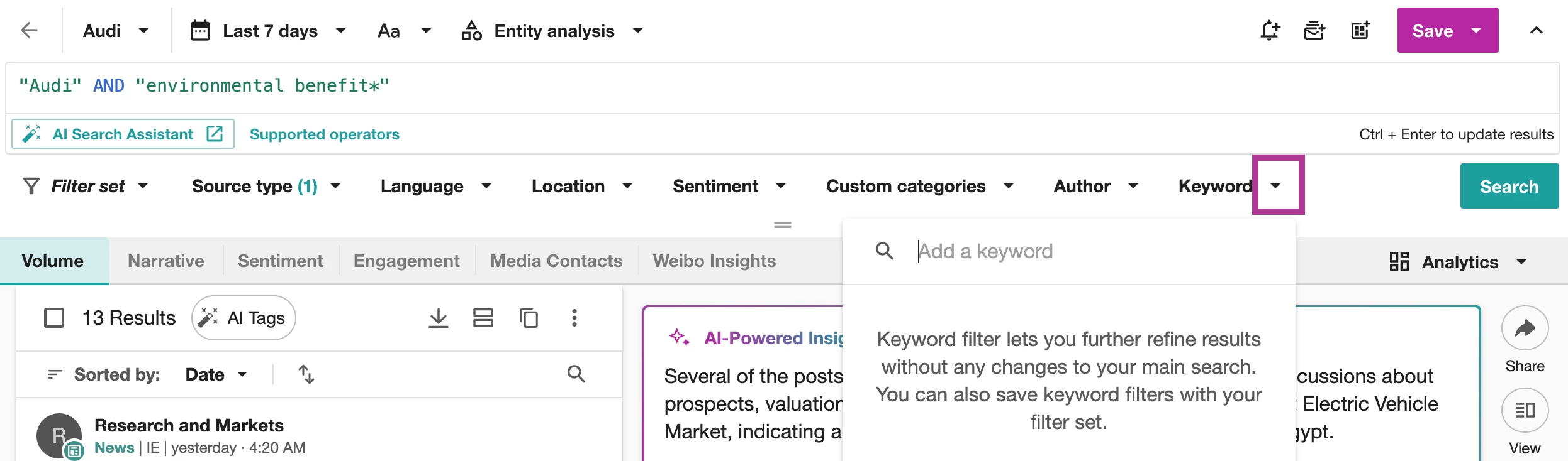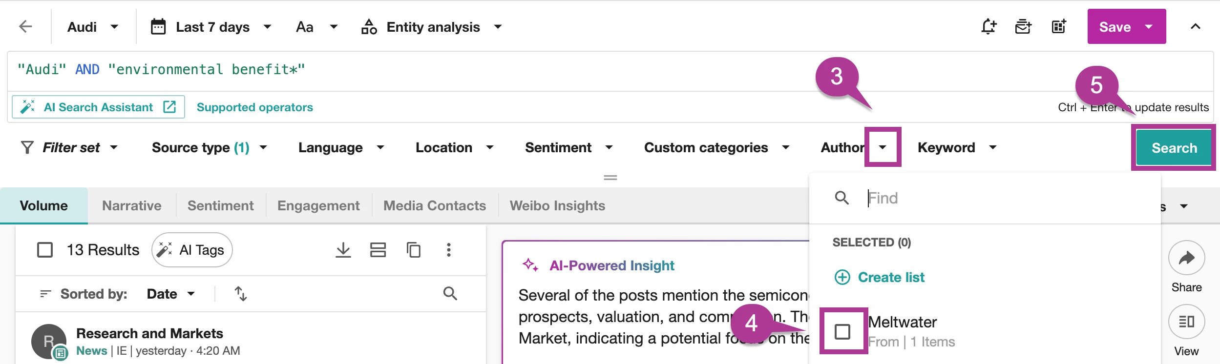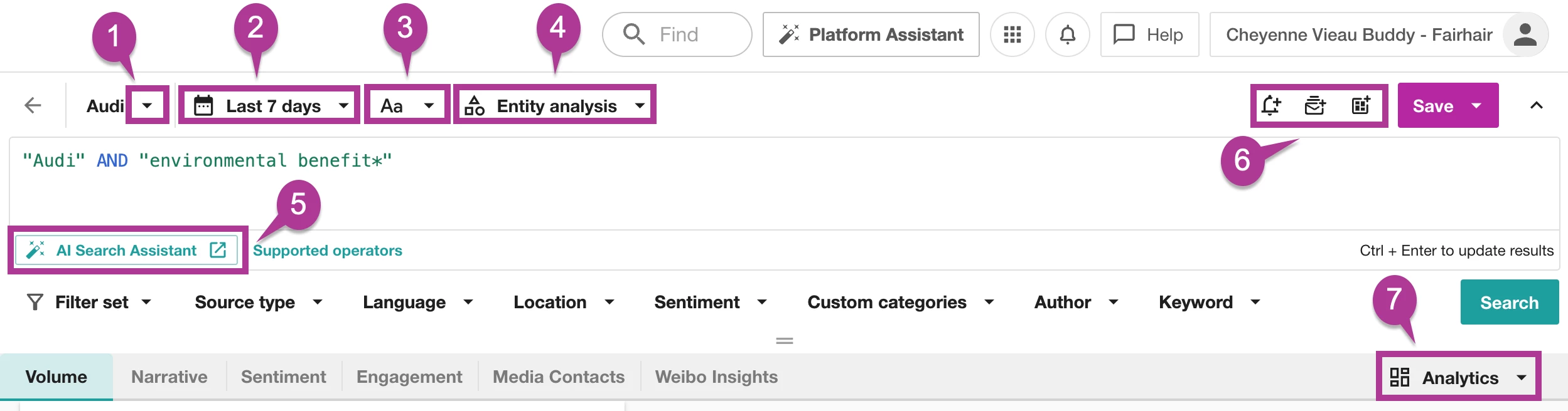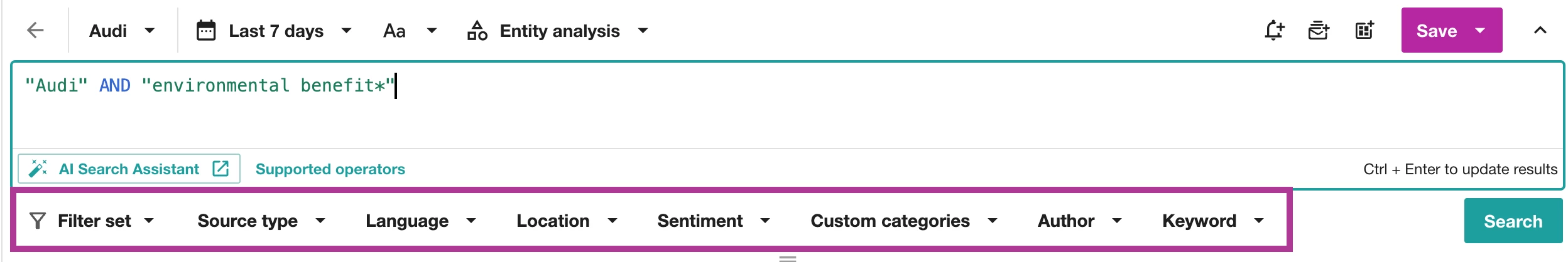 AI Search Assistant: Leverage the AI chatbot's deep understanding of the Meltwater Boolean language and streamline the search query writing process. Learn more about the AI Search Assistant.