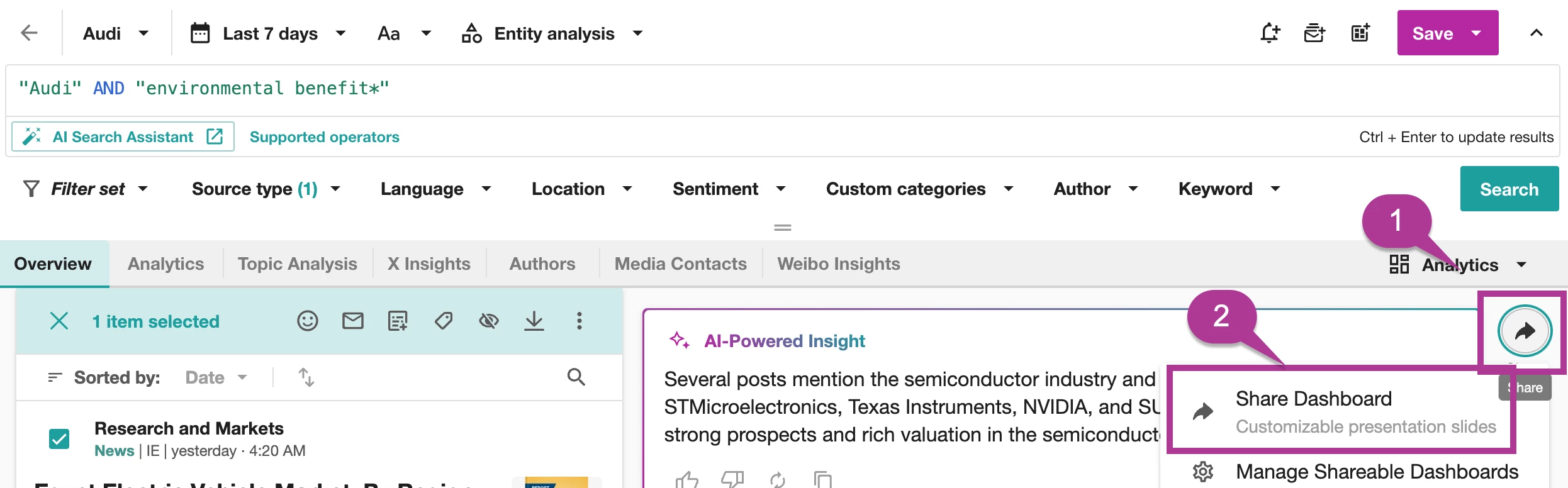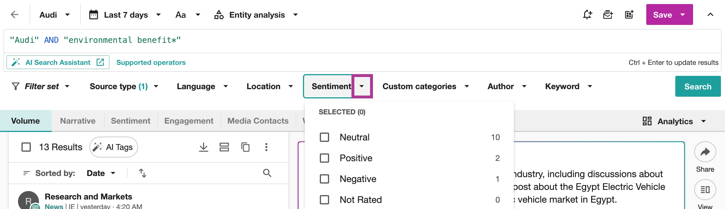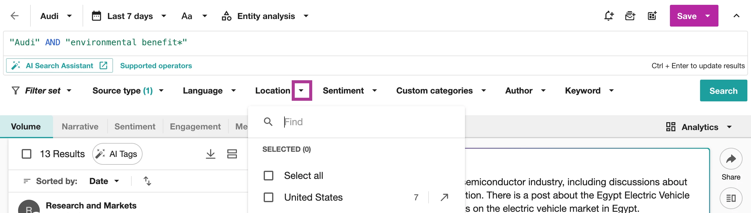 AI Search Assistant: Leverage the AI chatbot's deep understanding of the Meltwater Boolean language and streamline the search query writing process. Learn more about the AI Search Assistant.