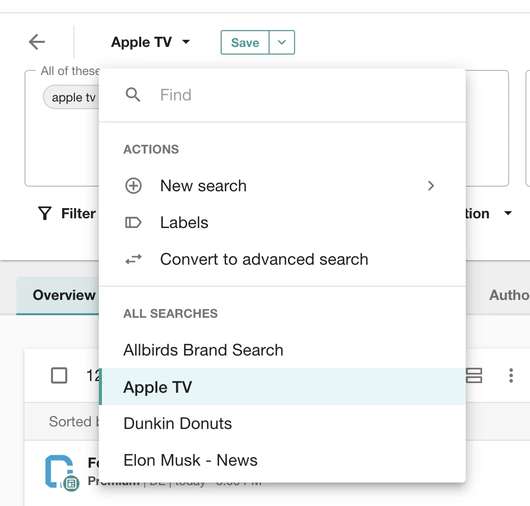 Apply labels: Add the opened search to an existing or new label. Learn more about Using Labels in Explore.