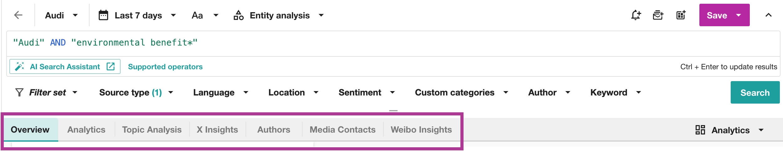 Dive deeper into your social media data with the Analytics tab. It helps visualize your data for better understanding. The focus of the Analytics tab is to show the volume of results broken down in a number of ways (e.g. by source such as top forums, by most shared links, etc.)