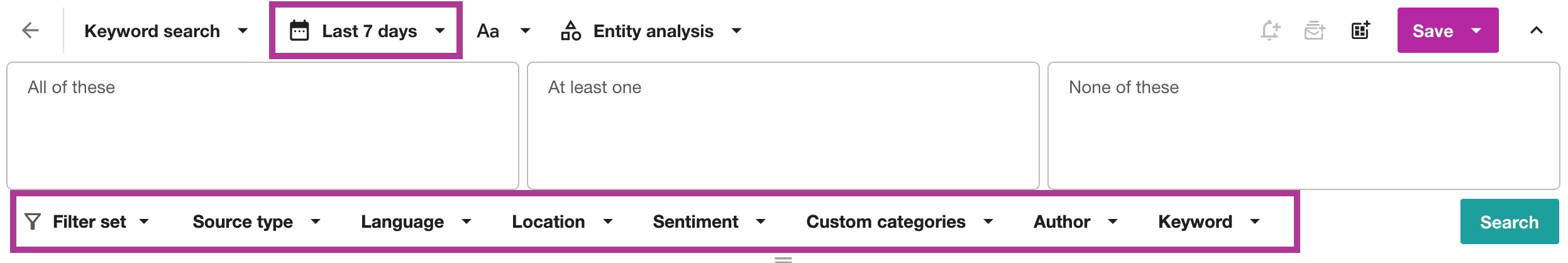 To build an advanced search, you will need to understand the Boolean search format. We offer Meltwater Academy courses and resources that will help you learn this. Think of Boolean as the grammar of your search. Just like sentences have structure, so should your queries. With Boolean, you can use terms like AND, OR, and NOT to make your searches smart and (very) specific.