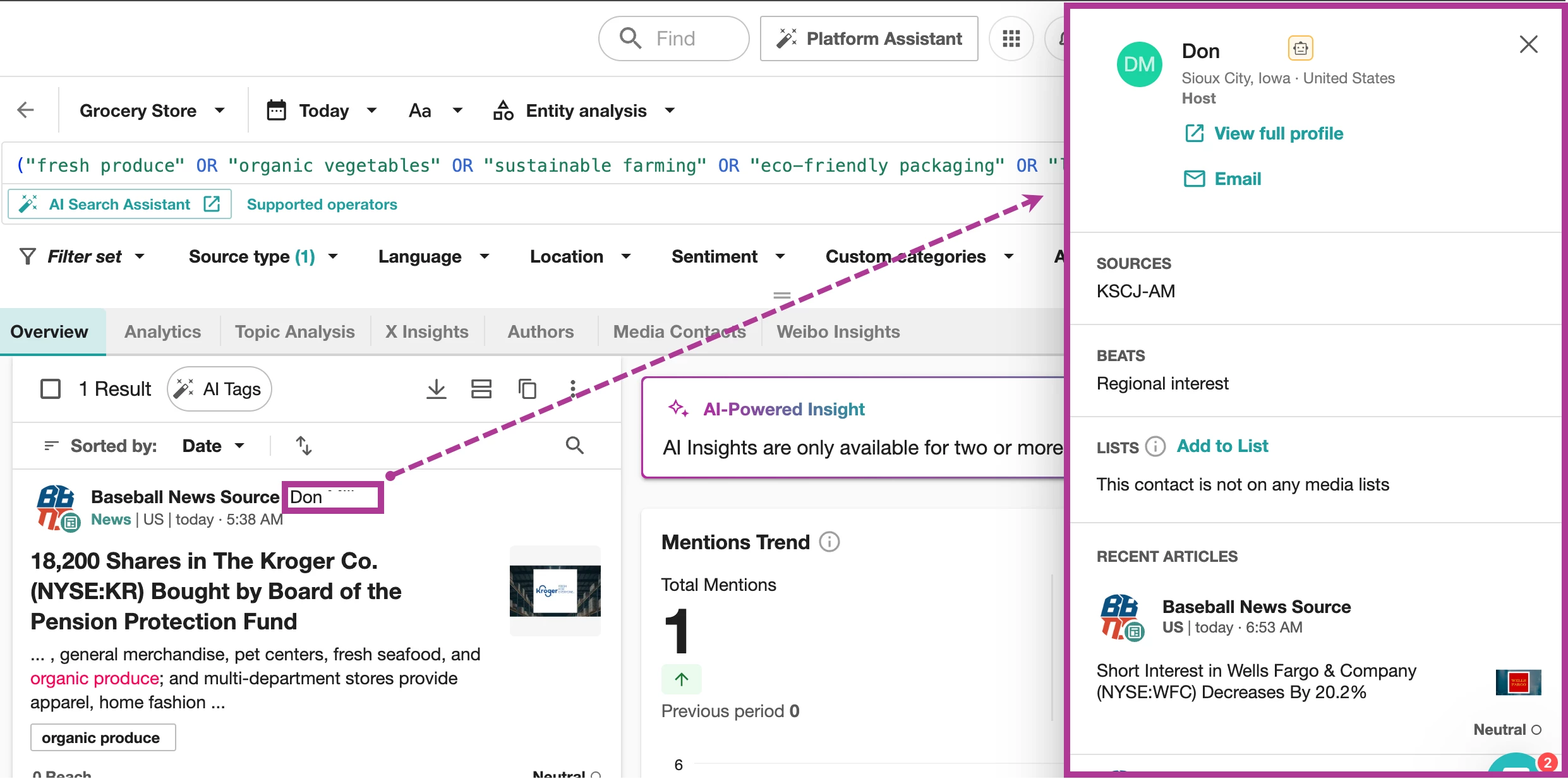 The Media Contacts tab in Explore helps you access profiles of journalists writing articles matching your query results! Easily identify, vet, organize and save lists of journalists that are most engaged about your topics.