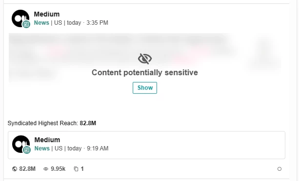 Possibly Sensitive Content warns you if the content populating in your searches might not be suitable. This content can be automatically blurred. To expose the content, click Show or click the article. To opt out of this, please contact your Meltwater contact.