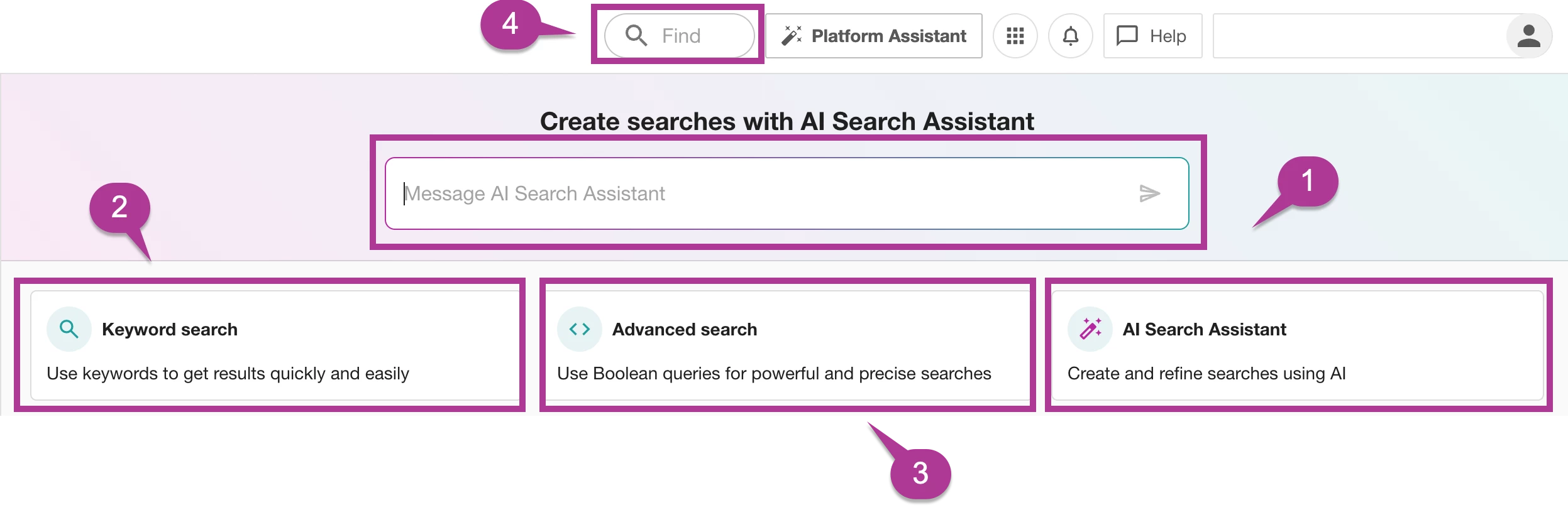 Alternatively to creating an Explore search from a Keyword or Advances Search, you can use the AI Search Assistant. The AI Search Assistant makes it easier for users of all experience levels to create high-quality search queries—faster and with less effort. This leads to more accurate results and frees up time for data-driven decision-making. Learn more about the AI Search Assistant.