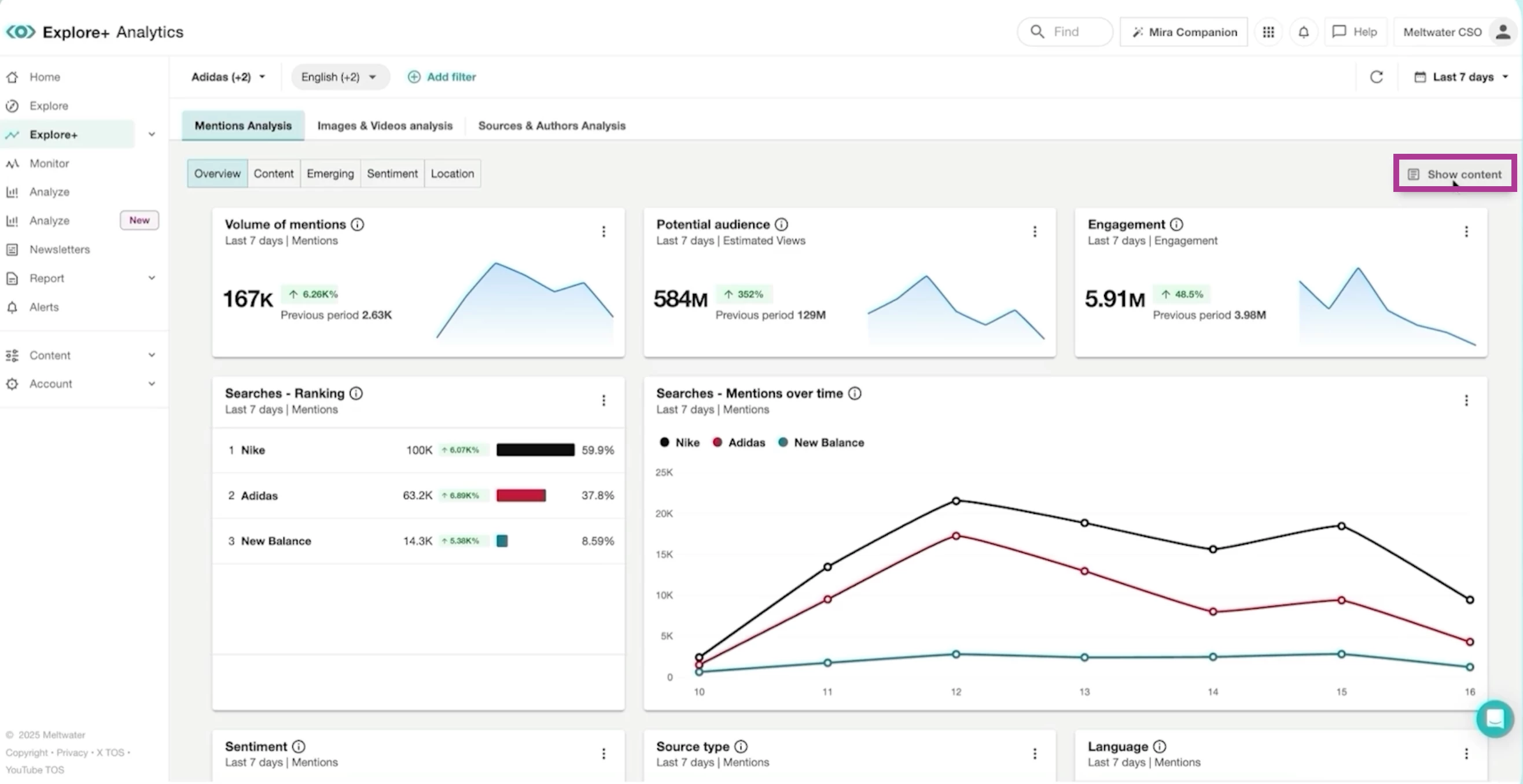 The Analytics section in Explore+ lets you dive deeper into your media searches by visualizing and comparing results across different topics, brands, or campaigns.
