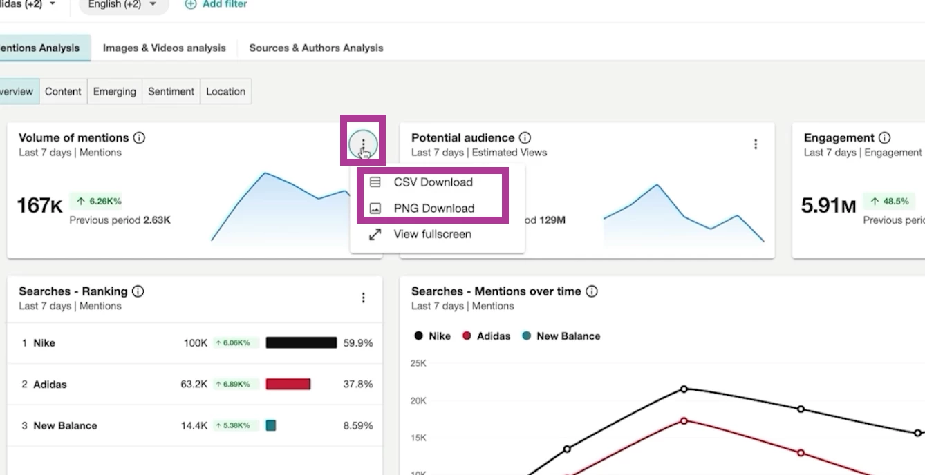 - Mentions Analysis: Understand what is being said and how people feel about it. Subtabs include: