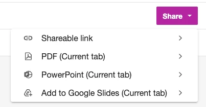 Yes, you can export as a PDF, Power-Point, Google Slides, or generate a shareable link by selecting the Share drop-down in the top right-hand corner.