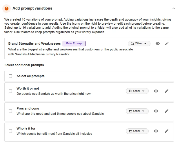 接下来Add Prompt Variations。选择最多10种提示变体(这些将计入你的总提示数)。