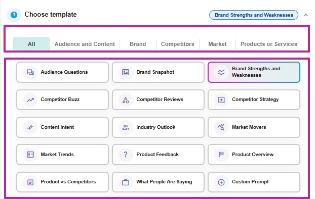 首先需要Choose a template或选择Custom Prompt创建自己的模板。提示按使用案例标签进行分类: