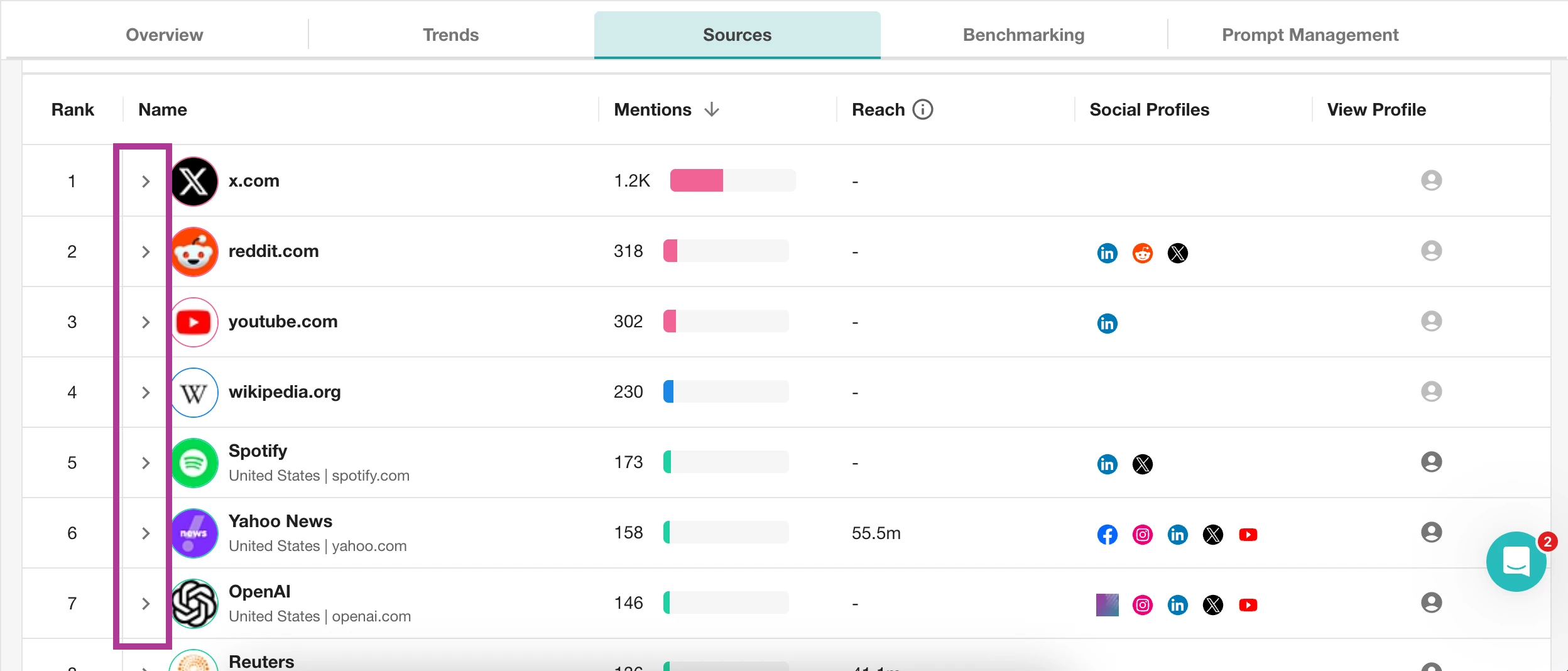 - 点击每个来源下拉菜单以查看用于影响 LLMs 输出的网址。