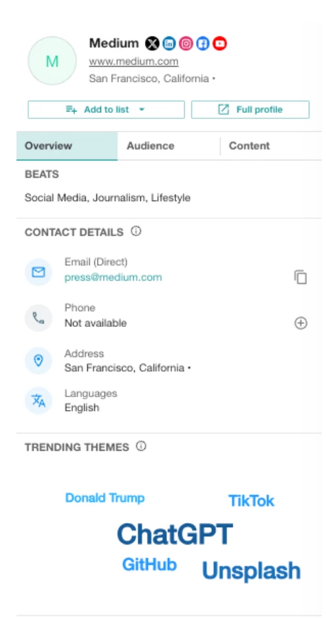 - 点击来源或记者名字以查看统一的档案,在右侧弹出窗口中进一步分析来源的报道、内容、联系信息或受众。