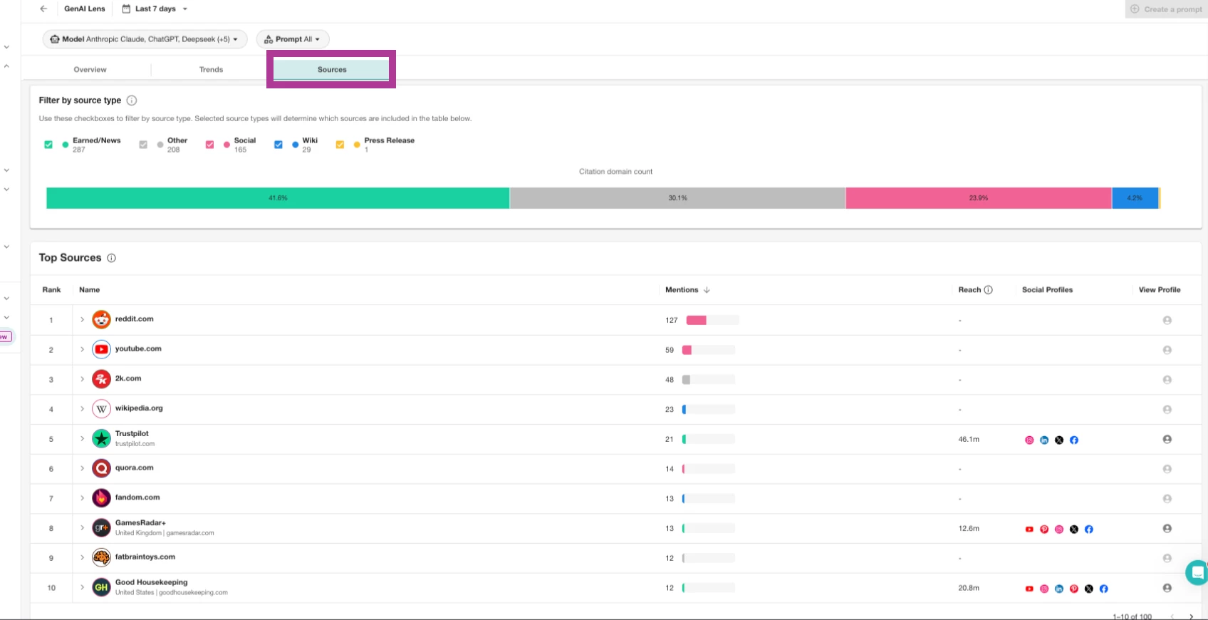 顶级来源:查看哪些网站、新闻媒体或平台在 GenAI 响应中被引用最多。
